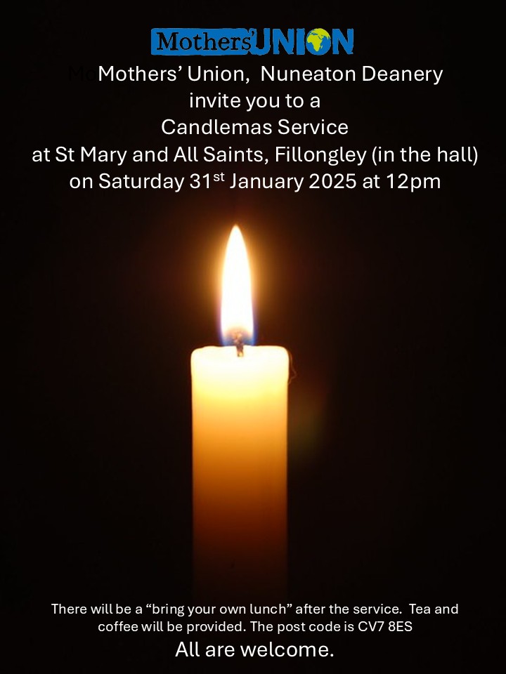 As you know, we will be hosting the Nuneaton Deanery Candlemass Service at Fillongley on Saturday 31st January at 12pm in the hall. I am very happy that Revd. Steve Medley has kindly agreed to lead the service again.