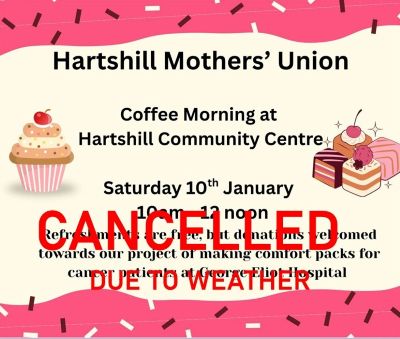 Unfortunately, we had to cancel the coffee morning on 10th January due to heavy snowfall the previous day. Nick M. has suggested that we rearrange it for the 21st February, to coincide with a planned Church Project event. Please let me know if you would be willing/able to assist with this.